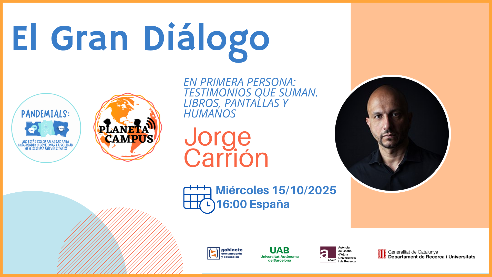 El Gabinete de Comunicación y Educación de la Universitat Autònoma de Barcelona, bajo la dirección del catedrático Santiago Tejedor, organiza la decimosexta y última sesión del ciclo ‘El Gran Diálogo’. El encuentro, titulado “En primera persona: testimonios que suman. Libros, pantallas y humanos”, tendrá lugar el próximo miércoles 15 de octubre de 2025, a las 16:00 (hora de España) y estará protagonizado por el escritor Jorge Carrión.
