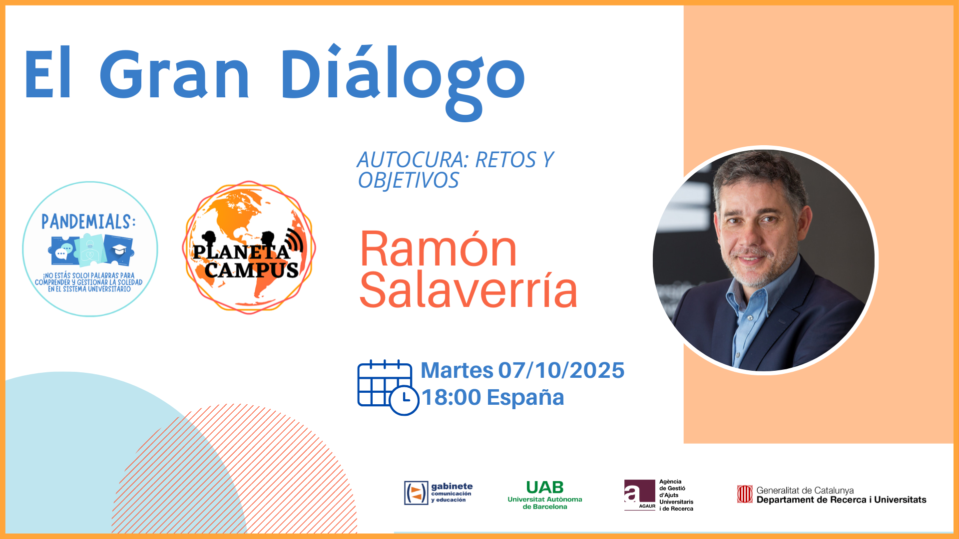 El Gabinete de Comunicación y Educación de la Universitat Autònoma de Barcelona, bajo la dirección del catedrático Santiago Tejedor, organiza la decimoquinta sesión del ciclo ‘El Gran Diálogo’. El encuentro, titulado “Autocuidado: retos y objetivos”, tendrá lugar el próximo martes 7 de octubre de 2025, a las 18:00 (hora de España) y estará protagonizado por el catedrático de periodismo Ramón Salaverría.